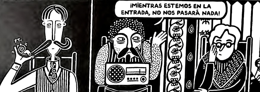 Y eso es todo lo que veremos del exterior, pues el cómic transcurre por completo en la habitación más segura de un edificio de pisos, la entrada a una vivienda familiar, que se convierte en el lugar de refugio, reunión y apoyo de una comunidad de vecinos.